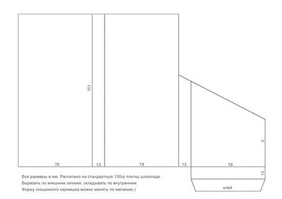 Разные варианты расположения шоколадки, с кармашками для пакетиков с чаем, для тега, и в виде коробочки, в форме сумочки, ... и много, много других вариантов.