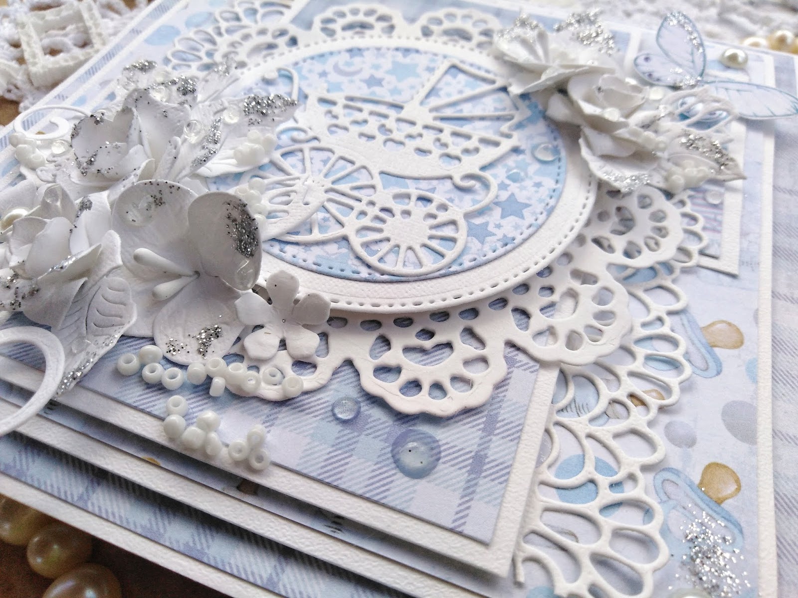 Для того, чтобы открытка не выглядела скучно я добавила на цветы немного глиттера, а в композицию чуть-чуть топпинга в виде крупного белого бисера.
