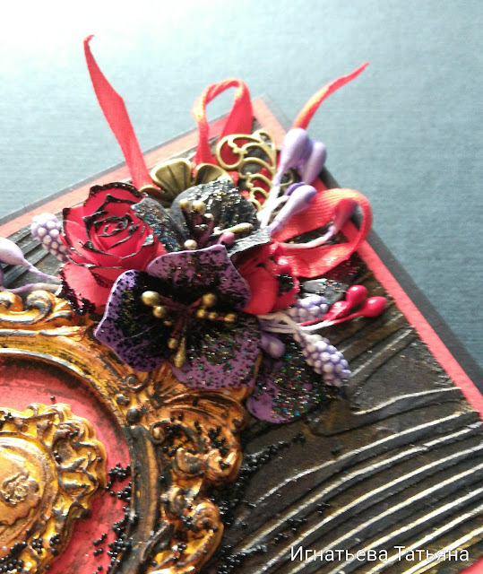 Уже на готовых цветах ручной работы я сделала небольшой эмбоссинг чёрной пудрой с глиттером. Добавила микробисер, металлические элементы в виде цветов, атласную красную ленточку и тычинки.